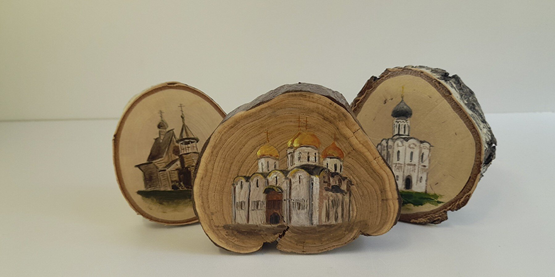В рамках проекта "Лето в Москве" организаторы попросили Сергея презентовать и более простые товары. Благодаря этому он придумал наносить рисунки на деревянные спилы березы, ивы, дуба и яблони.