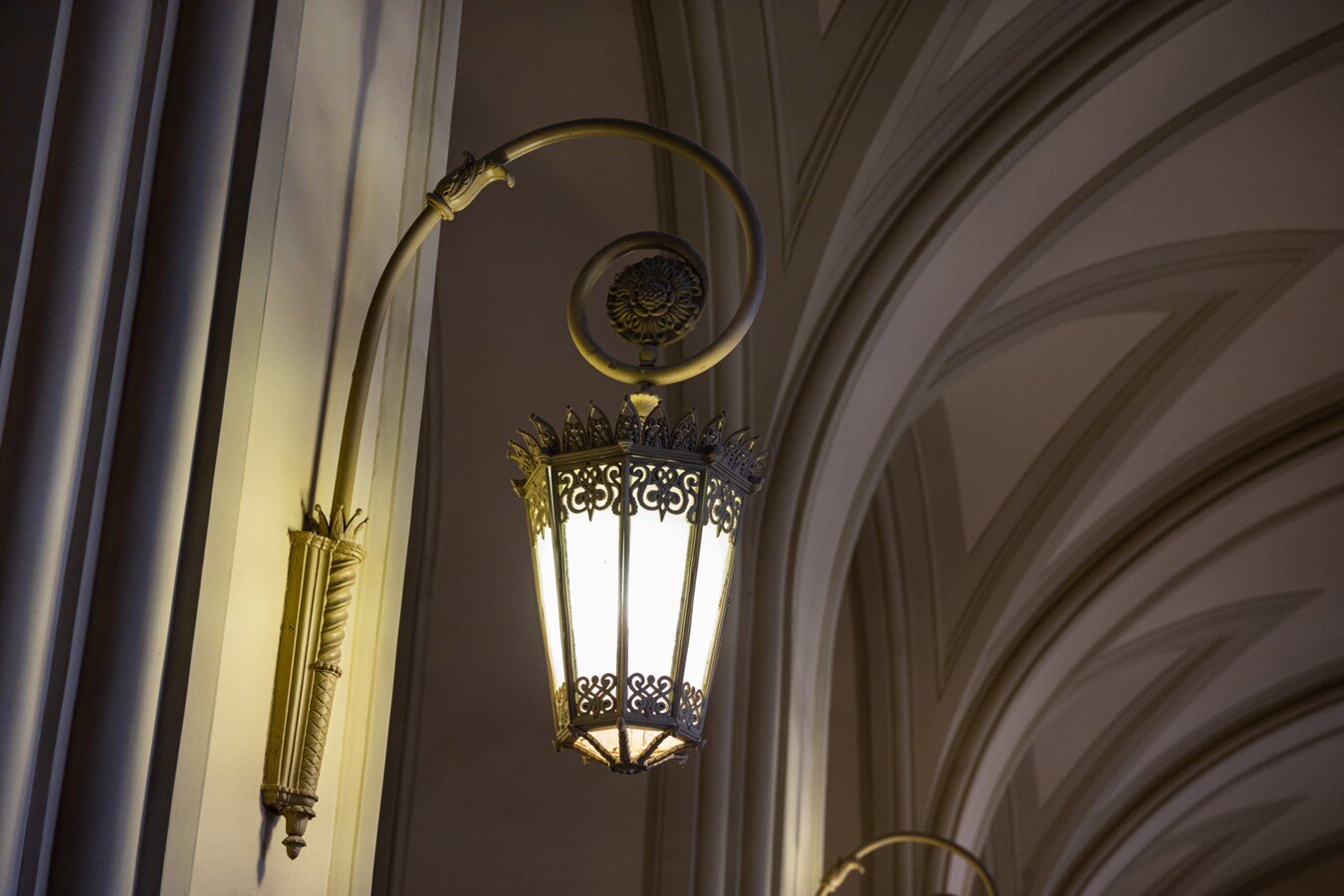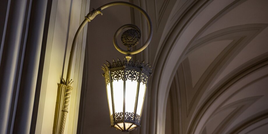 Осветительные приборы, установленные в советское время, были выполнены из металла с медным покрытием. Кроме того, на ряде светильников были обнаружены фрагменты позолоты из сусального золота. Эти элементы были демонтированы, и на их месте появятся новые – разработанные с учетом стилистики XIX века. Также в проекте предусмотрено размещение настенных бра. Новый световой сценарий обеспечит достаточный уровень освещения зала, при этом будет соответствовать историческому образу интерьера.