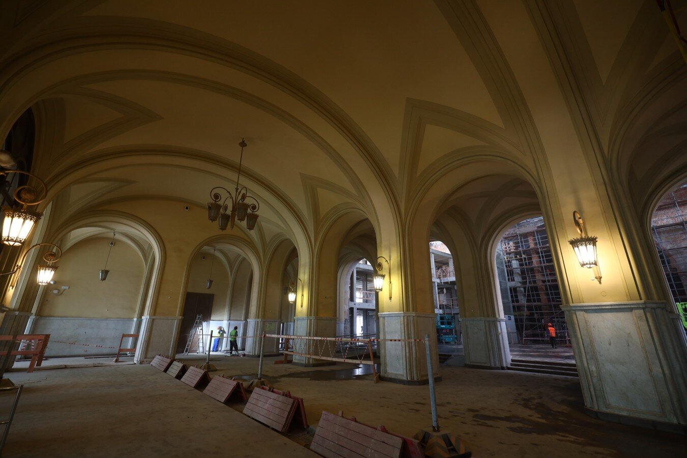 Отделка исторического зала Ленинградского вокзала представлена гранитными полами и мраморными панелями в нижней части стен. Для прокладки современных инженерных коммуникаций – кабельных каналов, электропроводки и системы видеонаблюдения – полы и облицовка частично вскрываются. Все работы проводятся с соблюдением принципов щадящего вмешательства, с последующим восстановлением оригинального вида отделки.