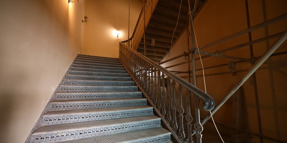 В ходе исследований на вокзале также были выявлены несколько оригинальных чугунных лестниц, относящихся к 1851 году. Одна из них, ведущая с первого на второй этаж, выполнена методом каслинского литья и сохранилась в хорошем состоянии. Поверхность имеет естественные следы износа, которые реставраторы планируют подчеркнуть, чтобы сохранить ощущение подлинности.