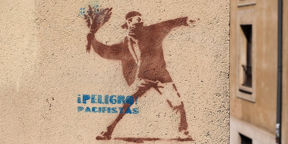 Это граффити было создано Бэнкси по пути к Вифлеему из Бейт-Сахура в Палестине. На нем местный житель в маске бросает в невидимого врага не камень, а цветы, таким образом реагируя на палестино-израильский конфликт. Считается, что художник своим рисунком выразил надежду, что однажды люди будут выяснять отношения более дипломатичными способами. Граффити настолько полюбилось людям по всему миру, что с этим принтом стали выпускать футболки, чехлы для телефонов и многое другое.
