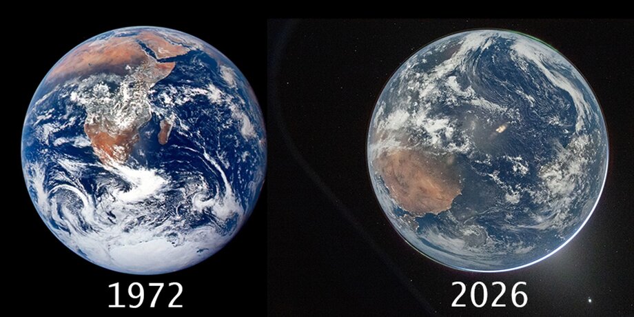Общим в двух этих кадрах можно считать то, что они называются фотографией и были сделаны человеком с борта космического корабля. Первый был получен с помощью химического процесса, второй – с помощью цифровой обработки. Пленка 1972 года облетела Луну и вернулась на Землю, по пути подвергнувшись воздействию космического излучения, и лишь тогда была проявлена. Файл 2026 года был передан на Землю по радиоканалу за долю секунды. Разрешение снимков, их цветопередача, контрастность – все это отличается коренным образом.