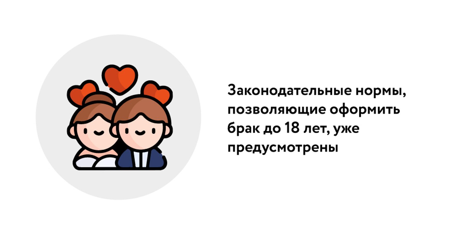 При этом законодательные нормы, позволяющие оформить брак до 18 лет, уже предусмотрены. В частности, сделать это в 16 можно при наличии уважительных причин, которые устанавливаются в каждом субъекте отдельно, сказано в Семейном кодексе.