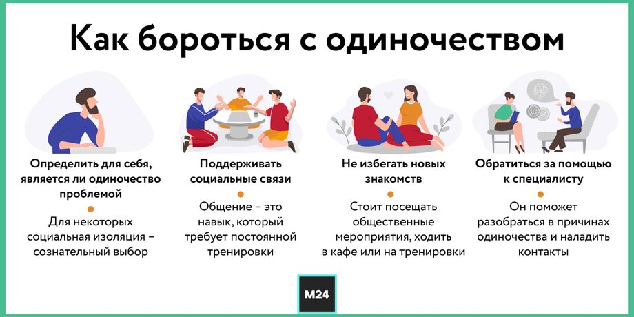В то же время лучший способ как борьбы, так и профилактики одиночества, – постоянное выстраивание и поддержание социальных связей, рассказала в беседе с Москвой 24 психолог Наталья Панфилова.