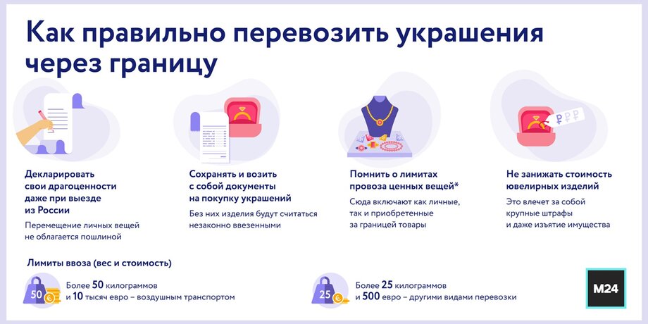В России нет ограничений по стоимости и весу украшений, которые можно вывезти из страны. Этот вопрос регулируется уже теми государствами, в которые направляются туристы, объяснил Георгий Мохов.