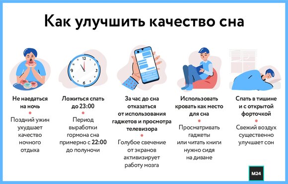 Чтобы улучшить качество сна, необходимо ложиться спать в период выработки мелатонина. Гормон вызывает сонливость и синтезируется примерно с 22:00 до полуночи, однако врач советует засыпать до 23:00.