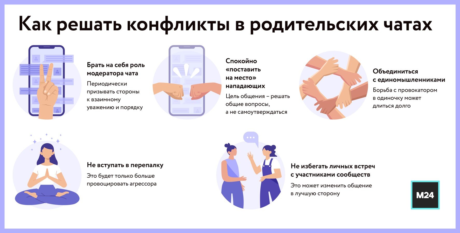 "В родительских чатах, в отличие от школьных с участием учителя, чаще всего идут серьезные баталии, потому что там нет модератора, который мог бы призвать к порядку. Кто-то должен периодически брать на себя такую функцию и напоминать про общие цели. Например: "Давайте, пожалуйста, каждый выскажет свое мнение, и затем мы будем искать какой-то компромисс", – посоветовала эксперт.
