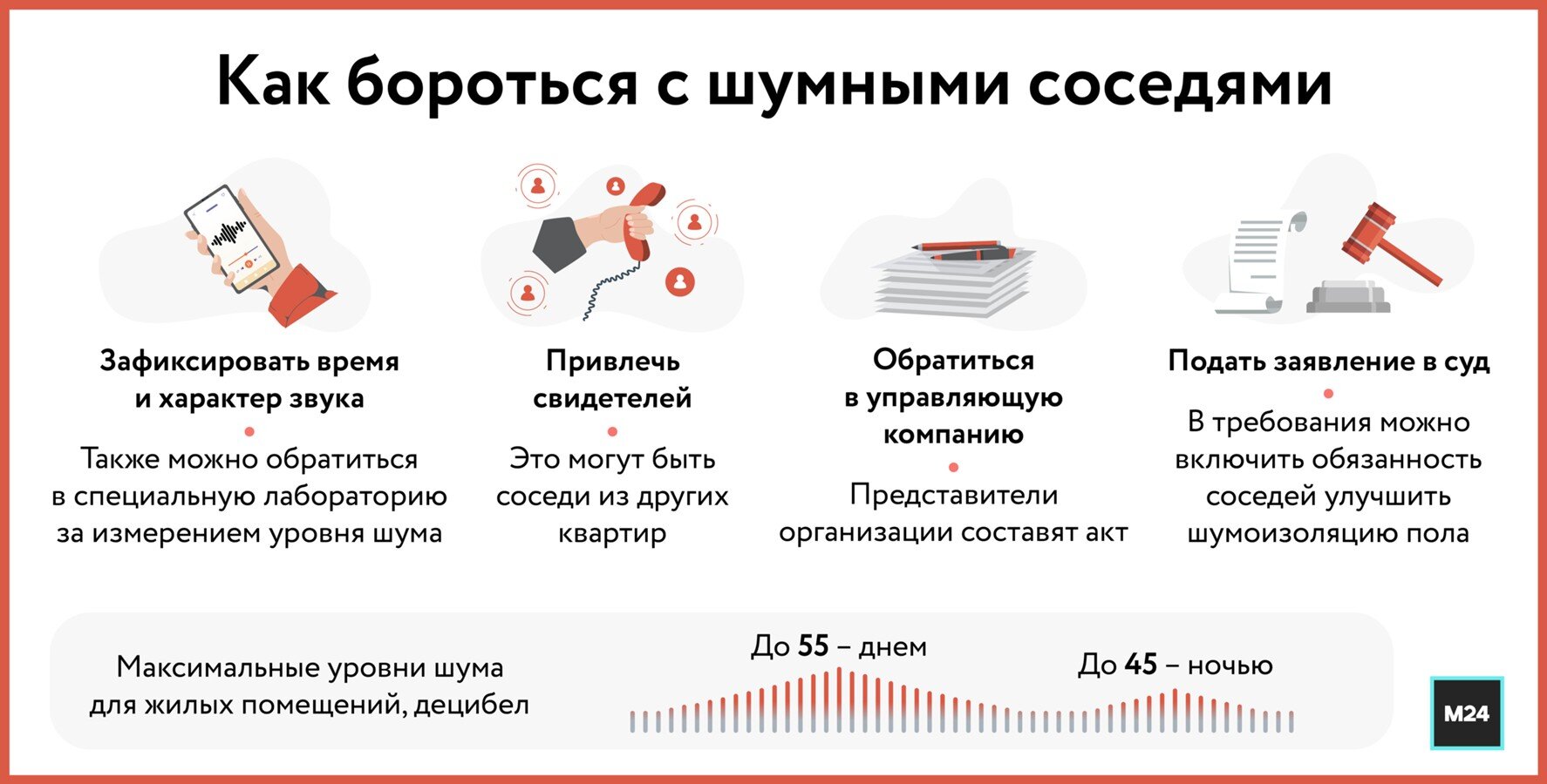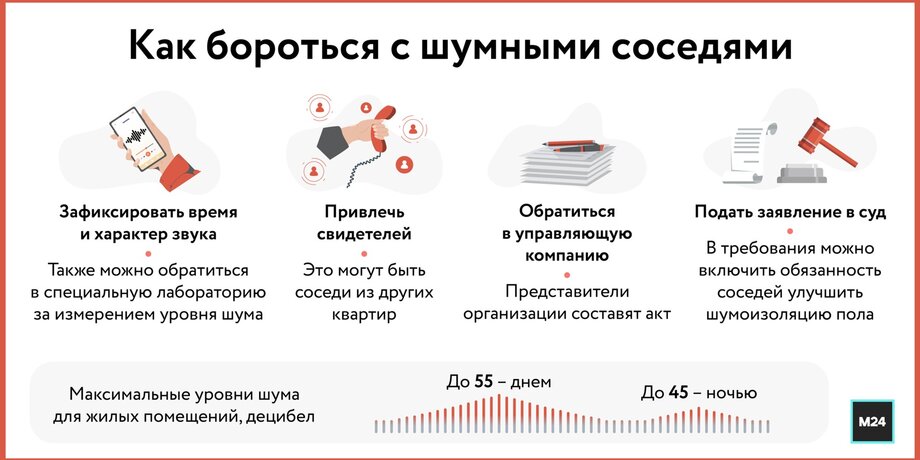 Эксперт также объяснил порядок действий в отношении шумных соседей. По его словам, сначала нужно зафиксировать время и характер звука, а также записать свидетелей. После этого пишется заявление в управляющую организацию с требованием составить акт.