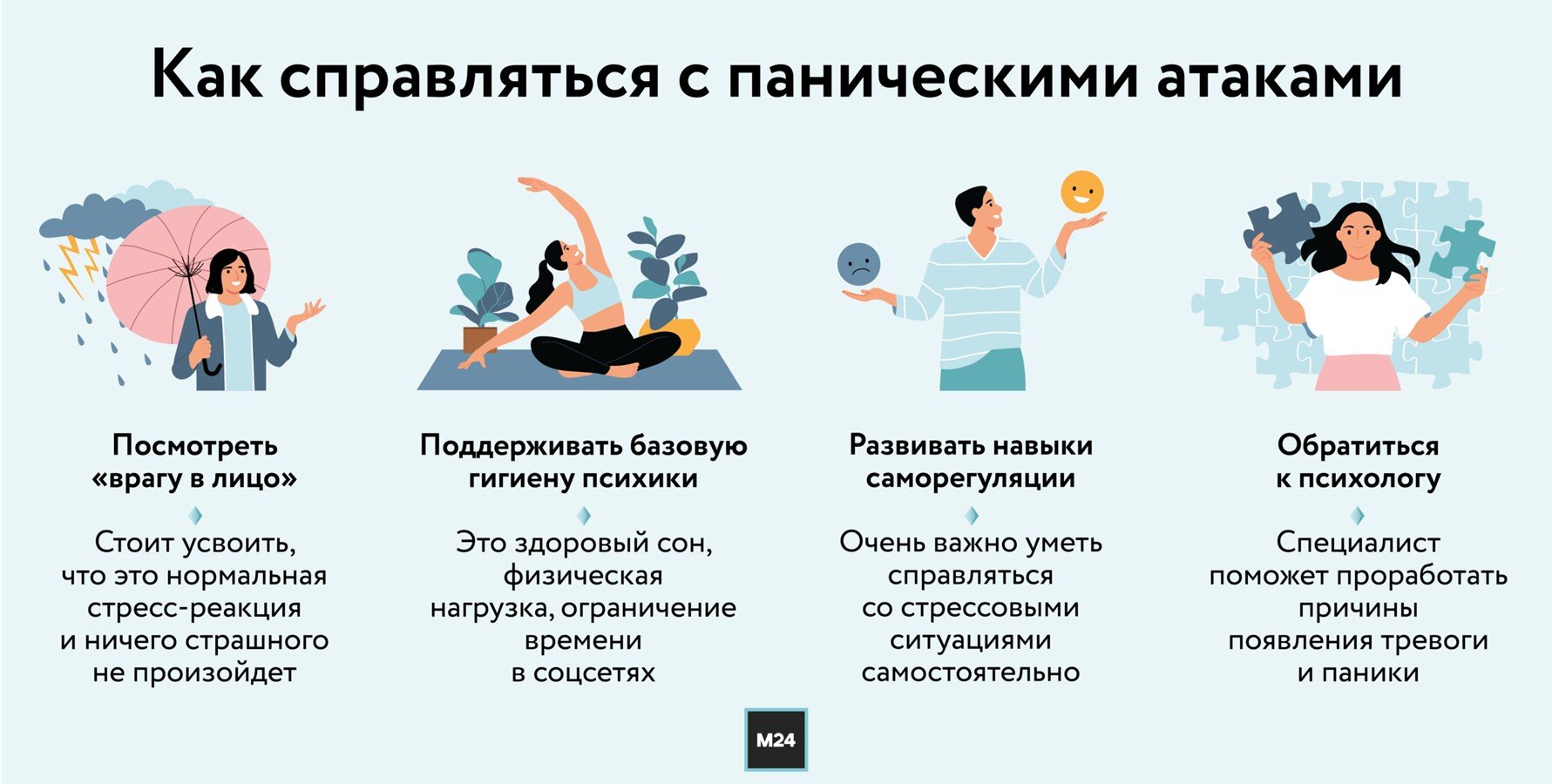 Попытаться справиться с ситуацией можно самостоятельно, но для этого важно понять механизм происходящего: больше узнать о панической атаке, усвоить, что это нормальная стресс-реакция, ничего плохого в моменте не произойдет.