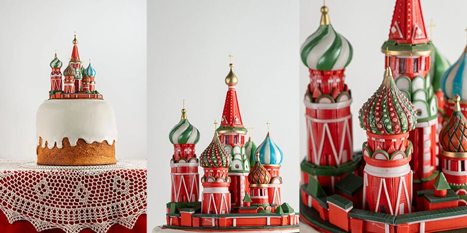 Одним из самых обсуждаемых в Сети вариантов традиционного пасхального угощения стал "Кремлевский" кулич. 4-килограммовый десерт украшен миниатюрной съедобной копией собора Василия Блаженного, выполненной из мастики и шоколада. На сайте указано, что лепка и роспись декора выполнены вручную.