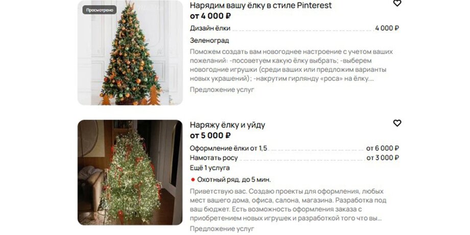 В преддверии Нового года на онлайн-платформах появилось множество частных объявлений с предложениями украсить елки и квартиры в целом. Декораторы готовы взять на себя подбор игрушек, а также распутывание гирлянд и их развешивание. В среднем такая услуга обойдется заказчику в 3–10 тысяч рублей.