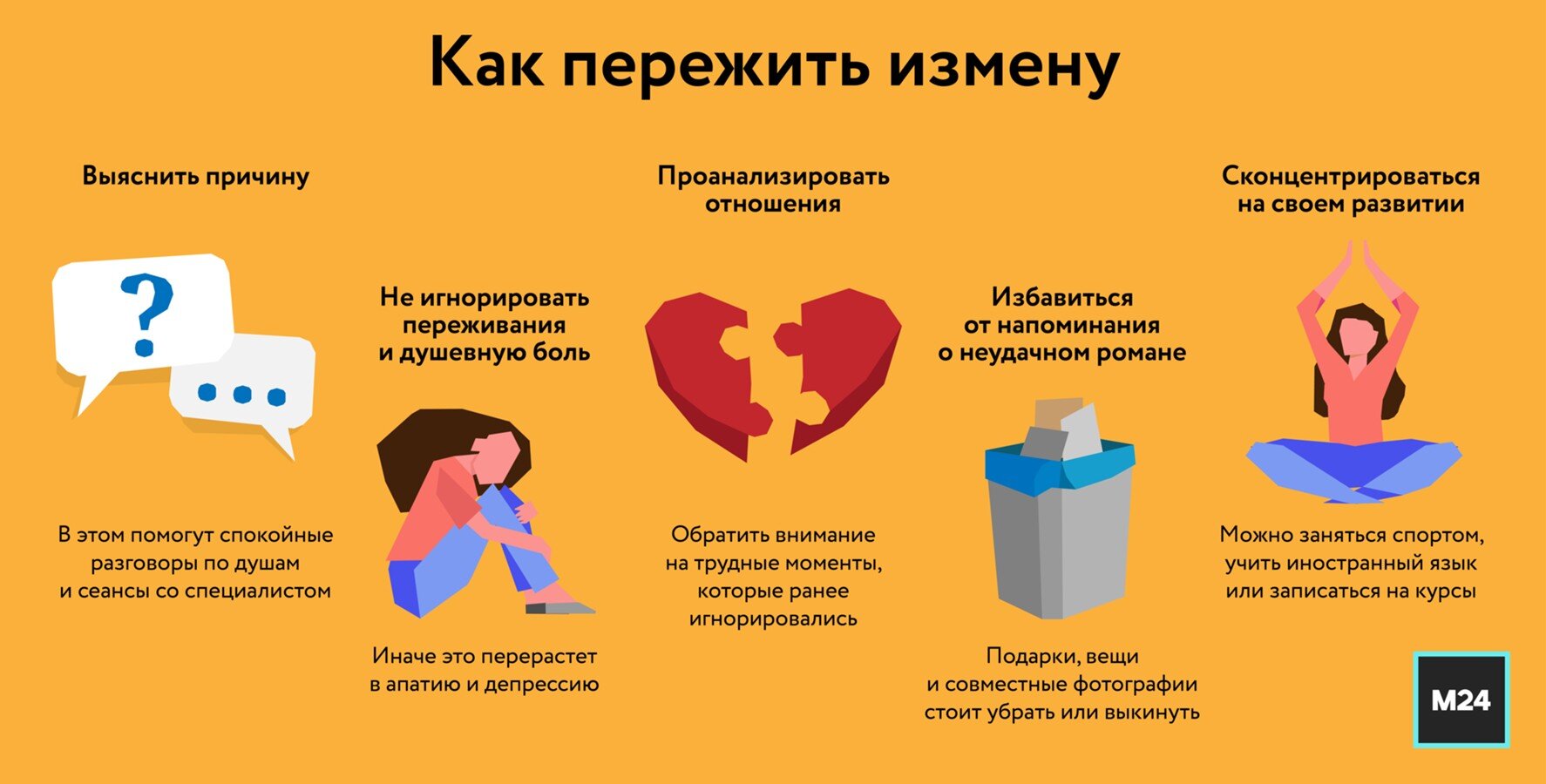Измена любимого человека – одна из самых болезненных и трудных ситуаций, которая бьет по самооценке и заставляет задуматься о том, как жить дальше. Как справиться с болью от предательства партнера, расскажет Москва 24.