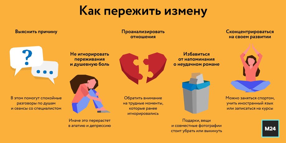 Экспертв советуют столкнувшимся с предательством проанализировать отношения и "убрать" из своей головы все идеализированные представления о романах, которые были раньше, пишет издание. Стоит обратить внимание на возможные предпосылки измены и трудные моменты, которые ранее игнорировались.
