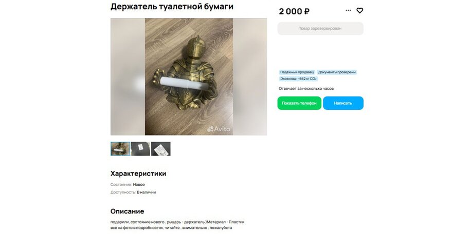 Например, москвич опубликовал объявление о продаже "средневекового" держателя для туалетной бумаги. За 2 000 рублей потенциальный покупатель получит держащего втулку рыцаря, покрытого под бронзу.