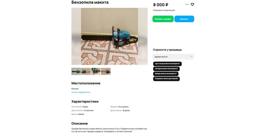 Другая москвичка продает японскую бензопилу. Для потенциальных покупателей женщина также решила уточнить причину продажи.