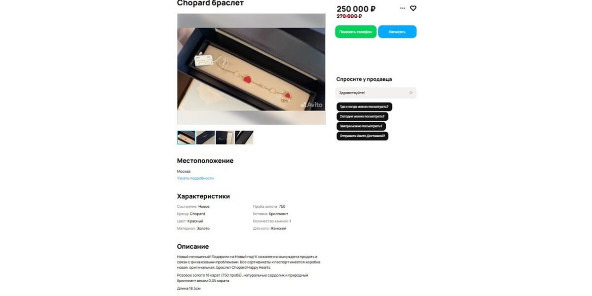 По словам продавца, расстаться с таким презентом ее заставили финансовые трудности. Стоимость украшения в магазине варьируется от 550 до 600 тысяч рублей – свой же автор объявления готова уступить за 250 тысяч.