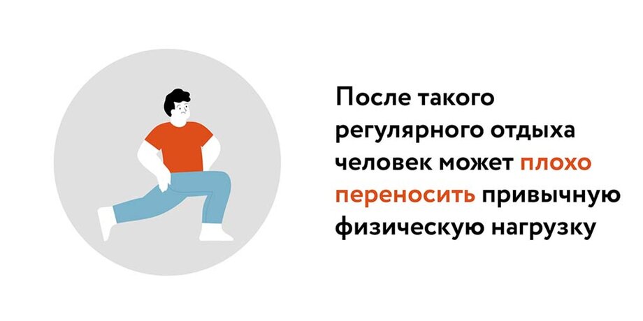 Как следствие, после такого регулярного отдыха человек может плохо переносить привычную физическую нагрузку. Из-за сниженной активности страдают мышцы, суставы и опорно-двигательный аппарат в целом, указал Кондрахин.