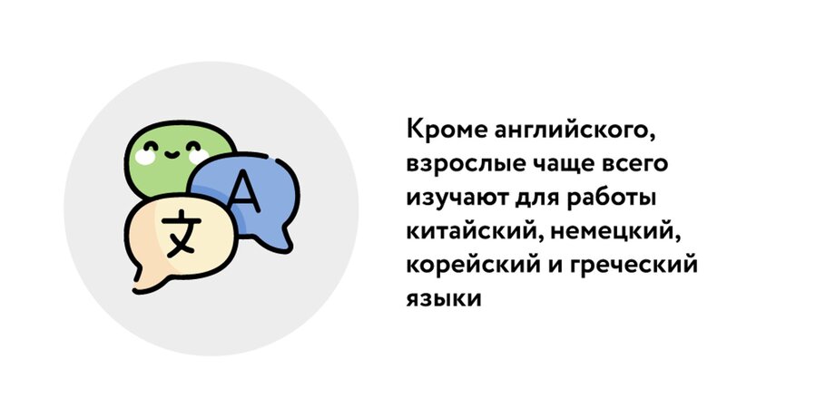 Академический директор одной из школ иностранных языков Анастасия Екушевская добавила, что, кроме английского, взрослые чаще всего изучают для работы китайский (55%) и немецкий (50%), затем корейский (34%) и греческий (33%). Для собственного удовольствия популярны японский (33%), французский (31%) и испанский (25%).
