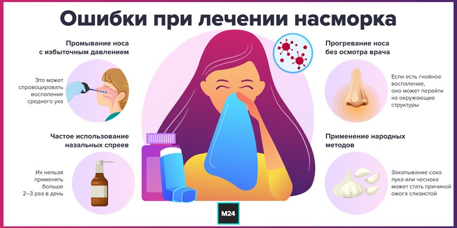 В целом же, говоря про лечение насморка, врач отметил, что крайне опасно прогревать нос без рекомендации врача: если имеется гнойное воспаление, оно может перейти из пазухи на окружающие структуры, в частности на глазницы.