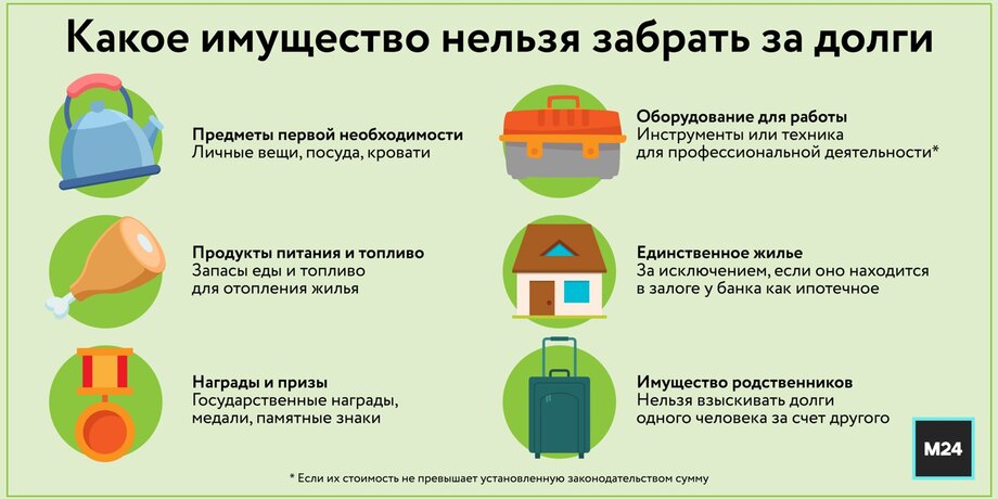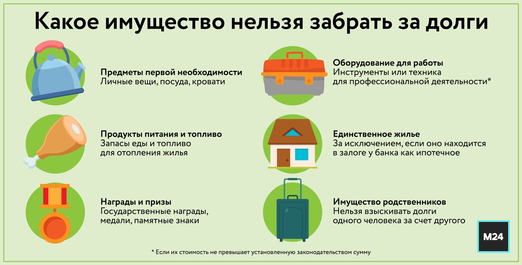 Например, это касается предметов обычной домашней обстановки, личных вещей, продуктов, топлива для отопления, наград, а также инструментов, необходимых для работы, если каждый из них стоит не больше десяти тысяч рублей. Все, что дороже, формально может подпасть под взыскание, пояснил эксперт.