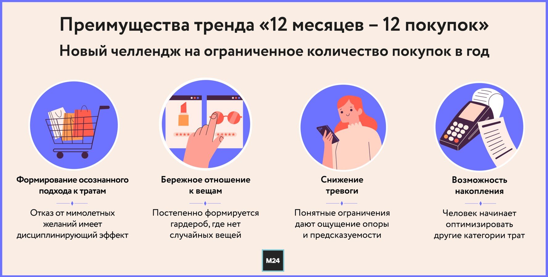 Зумеры продвигают в Сети тренд под названием "12 месяцев – 12 покупок". Как отмечают СМИ, он возник благодаря философии frugal chic ("бережливый шик"), которая возвела разумную экономию в ранг модного стиля жизни.
