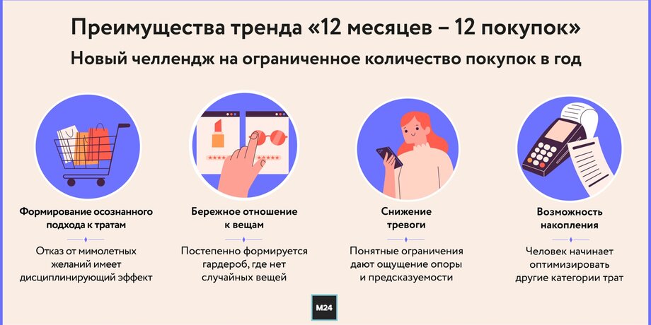 В Сети завирусился тренд под названием "12 месяцев – 12 покупок": вместо дешевых импульсивных приобретений на маркетплейсах зумеры выбирают единичные, но качественные вещи. Насколько это полезно для психологического и финансового здоровья, разбиралась Москва 24.