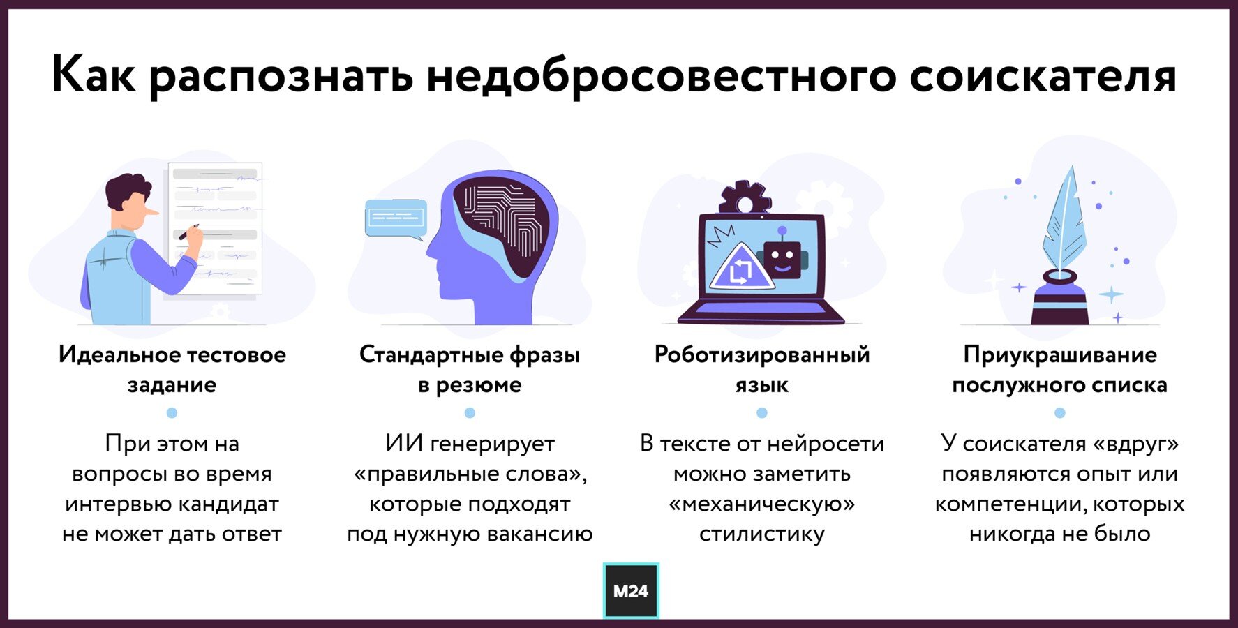"ИИ генерирует шаблонные фразы или выдумывает те или иные факты. Например, при создании резюме у соискателя могут появиться опыт или компетенции, которых никогда не было. Впоследствии это легко проверяется в том числе по рекомендациям с прошлых мест работы", – указала специалист.