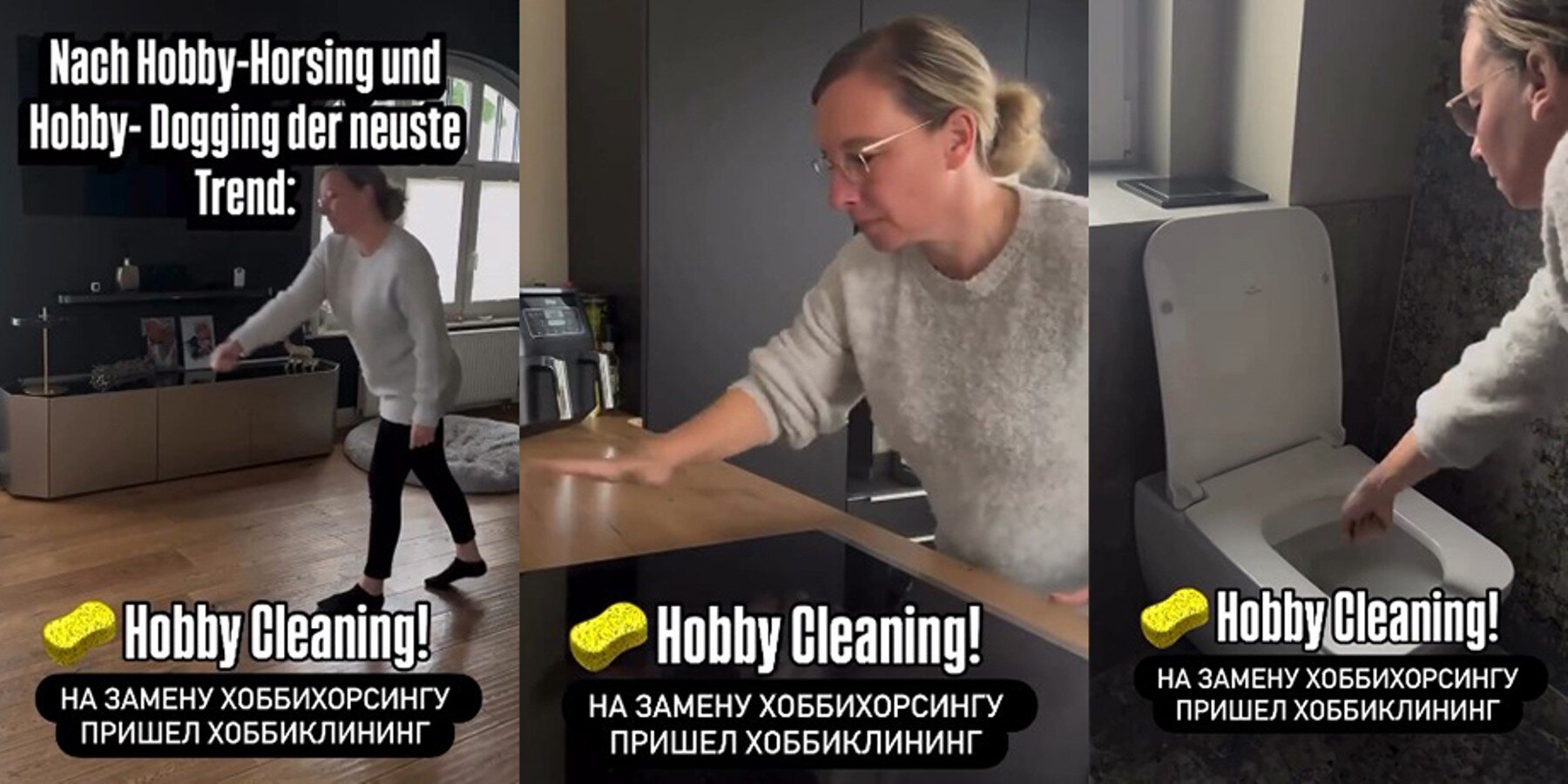 В соцсетях завирусился новый тренд – хоббиклининг: пользователи имитируют выполнение привычных бытовых обязанностей и снимают это на видео. Авторы роликов делают вид, что моют полы, протирают пыль, держа в руках несуществующую тряпку, а затем увлеченно протирают зеркала, даже не касаясь их.