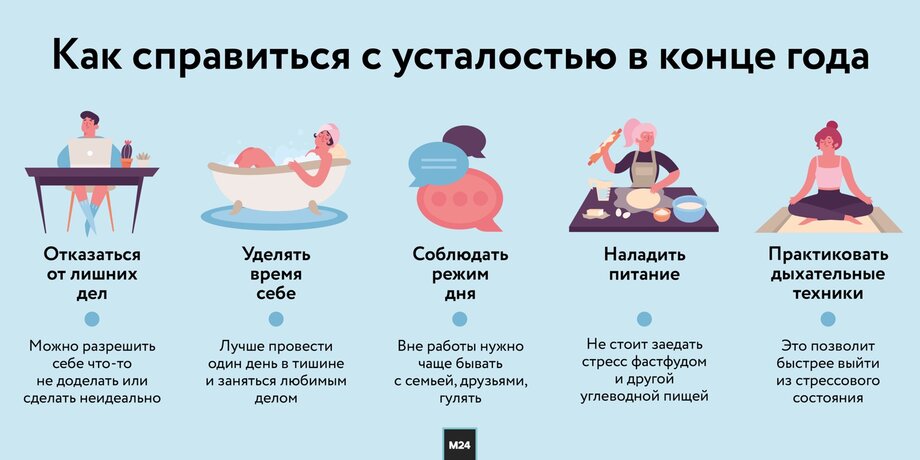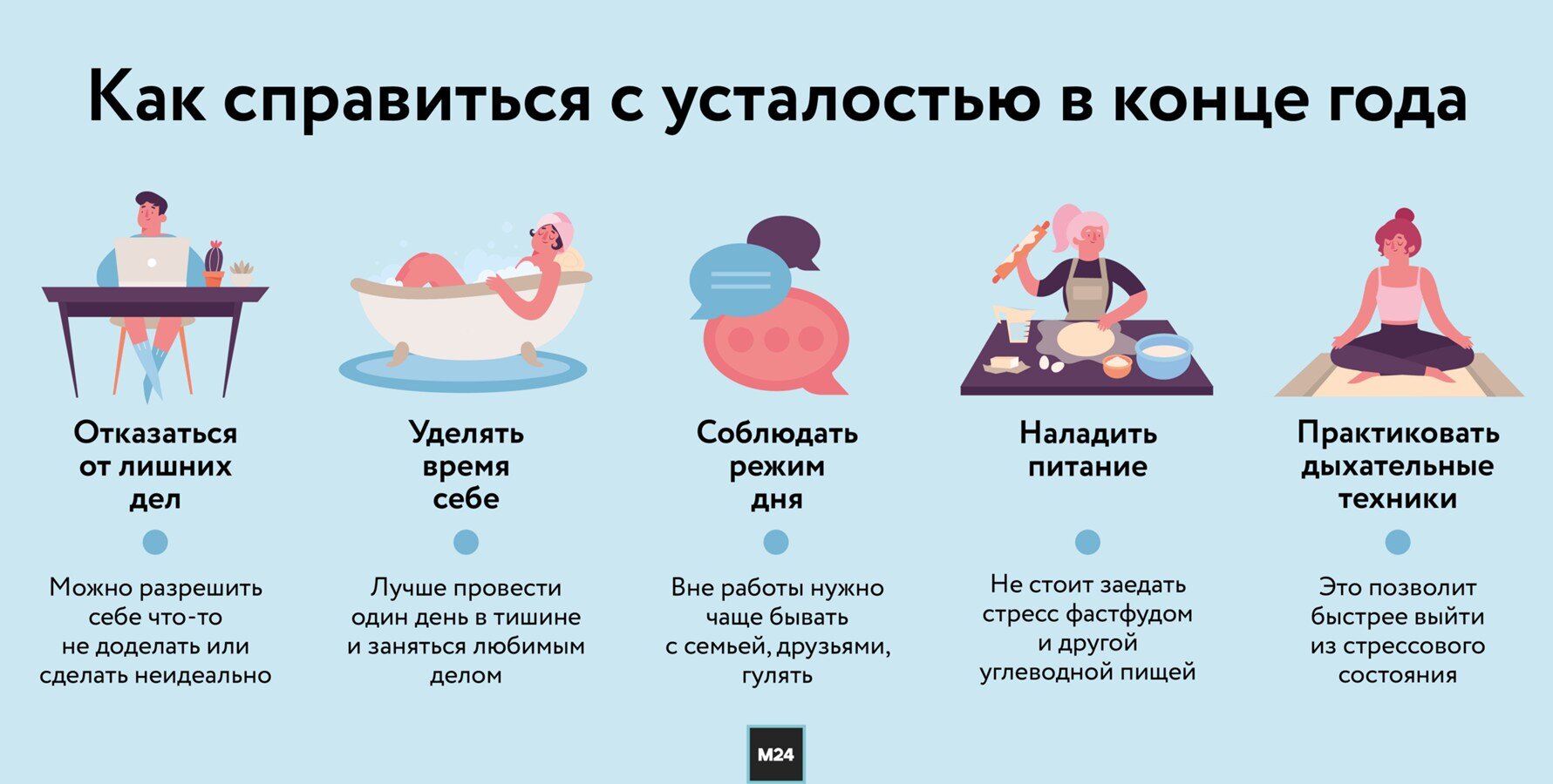 Чтобы справиться с усталостью в конце года, для начала нужно осознать саму проблему, посоветовала Стригунова. Затем важно отказаться от лишних дел и разрешить себе что-то не доделать или сделать неидеально, отметила специалист. Психолог также рекомендовала уделять себе минимум 20 минут в день, а также устроить разгрузочный выходной.