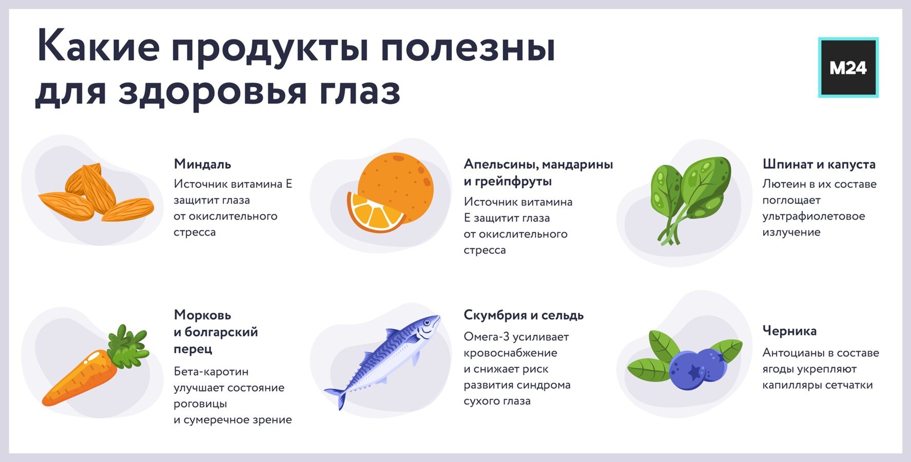Врач-диетолог, кандидат медицинских наук Дарья Русакова в разговоре с Москвой 24 в свою очередь посоветовала по возможности включать в ежедневный рацион полезные для здоровья глаз продукты.
