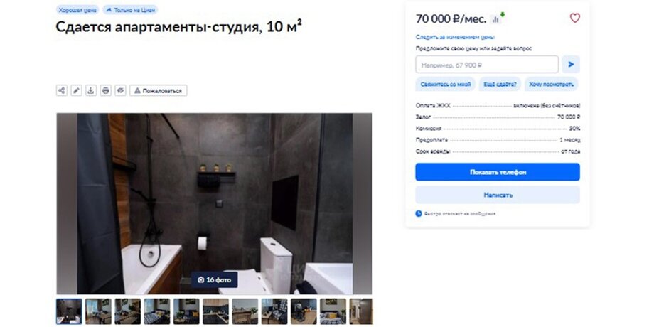 Апартаменты-студию с общей площадью 10 квадратных метров недалеко от метро "Электрозаводская" предложили арендовать за 70 тысяч рублей в месяц. Из удобств – холодильник, стиральная и посудомоечная машины, мебель, телевизор и кондиционер, а в самом помещении сделан "качественный ремонт".
