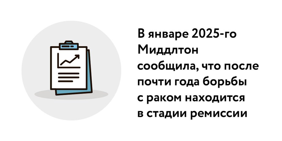 В январе 2025-го Миддлтон сообщила в соцсетях, что после почти года борьбы с раком она находится в стадии ремиссии. Принцесса Уэльская поблагодарила сотрудников Королевской больницы Марсдена, в которой проходила лечение, а также всех, кто был рядом и поддерживал.