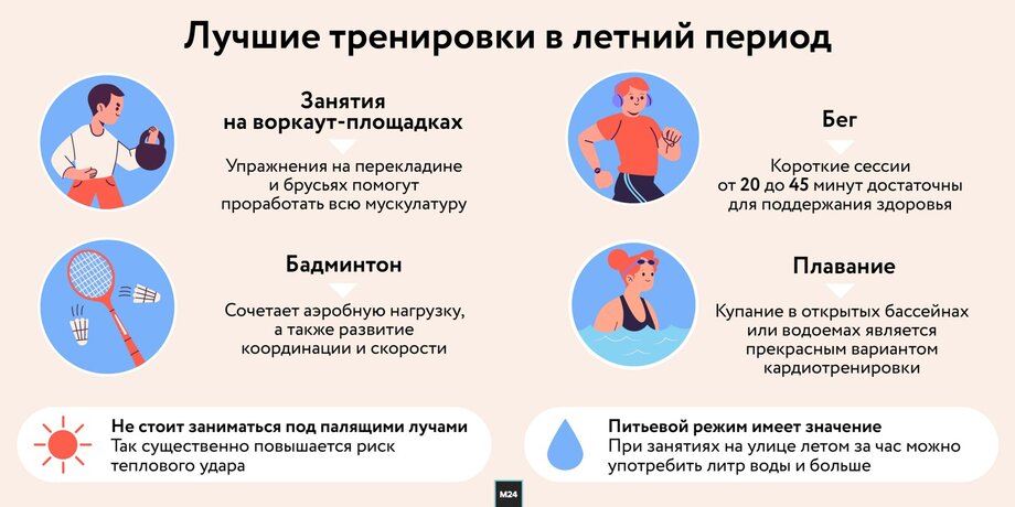 При этом важно понимать, что и у тренировок на улице есть свои ограничения. Главным из них является солнце. Помните: ни в коем случае не занимайтесь под палящими лучами, так как существенно повышаются риски получения теплового удара, а это острое состояние, при котором нужна помощь медиков. Другими словами, выбирайте утреннее или вечернее время для занятий либо ищите площадки, которые находятся в тени.