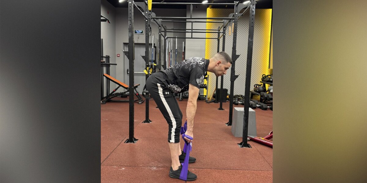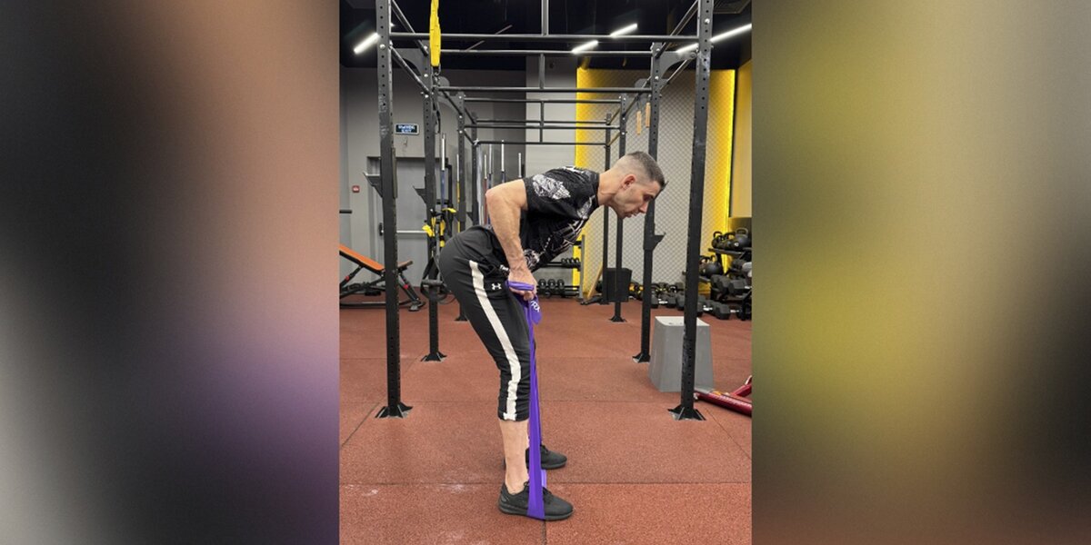 Здесь самое главное – держать спину ровно. В исходном положении встаньте стопами на резинку строго посередине. Возьмите резинку руками и, немного согнув ноги, наклоните корпус вперед (примерно на 45 градусов).