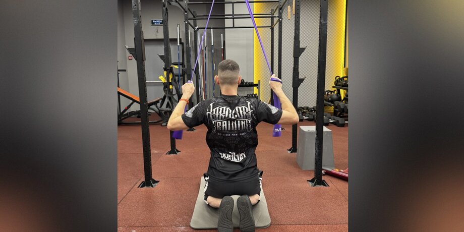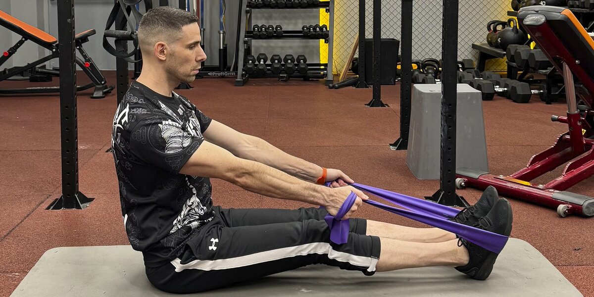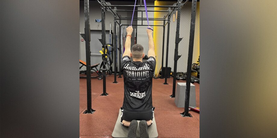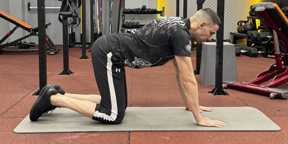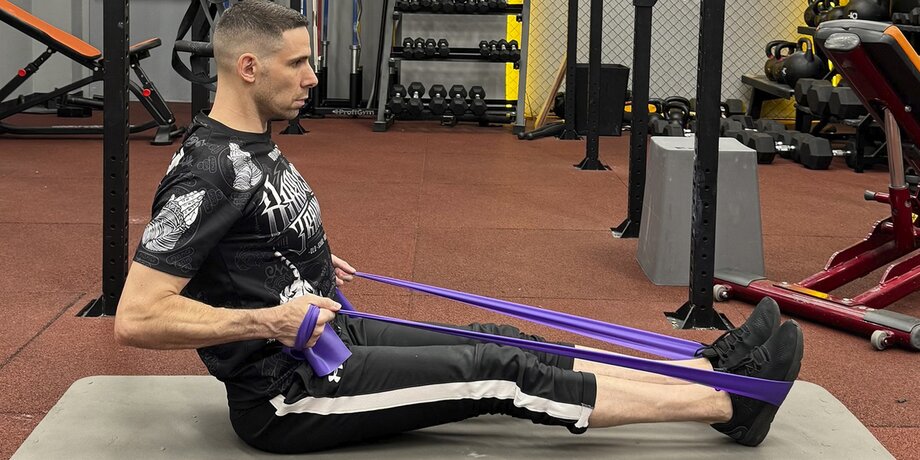Постелите фитнес-коврик и встаньте на него коленями. Возьмите резинку руками и намотайте на кулак так, чтобы в исходном положении (как на фото) резинка вас тянула вверх.