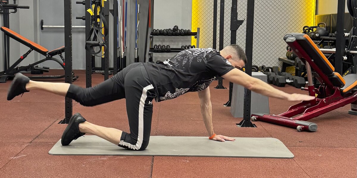 В исходном положении встаньте на колени и ладони. Сделайте вдох и на выдохе, одновременно двигаясь по прямой, вытяните в горизонталь правую руку и левую ногу.