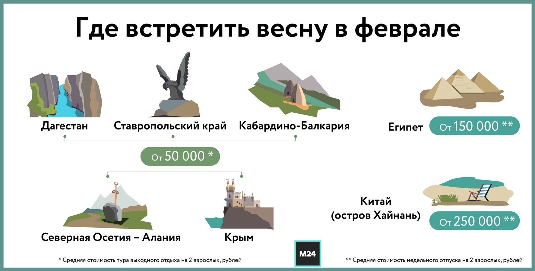 Он отметил, что отдых во всех вышеперечисленных локациях обойдется примерно в 50 тысяч рублей, если брать туры выходного дня (как правило, это трое суток). Потолок стоимости определить сложно, потому что все зависит от предпочтений отдыхающих. Также сэкономить помогут так называемые субсидированные рейсы по данным направлениям. Если же говорить про Крым, то в этом случае стоит рассматривать железнодорожный транспорт, заключил Мальцев.