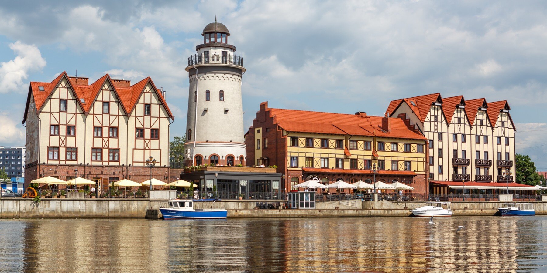 Рыбная деревня – туристический квартал в Калининграде в стиле старого Кенигсберга. Это новострой, но очень убедительный, и на его территории есть свой маяк – башня высотой в районе 30 метров, открытая для туристов. На входе симпатичные скульптуры: моряк с обезьянкой на лавочке и женщина-трактирщица, внутри ресторан, музей-магазин стеклянных изделий, сувенирная лавка и, самое главное, смотровая площадка. С нее открывается вид на Кафедральный собор и остров Канта, а на самой площадке, на шестом этаже, можно увидеть скульптуру чайки с яйцом, потереть которое считается хорошей приметой. А на седьмом этаже, на маленькой закрытой площадке, находится скульптура ученого кота с книжкой и в очках.