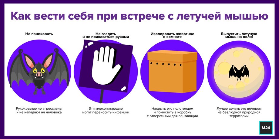 При обнаружении летучей мыши в квартире паниковать не стоит. Нужно спокойно изолировать ее в комнате и подождать, пока животное успокоится. После этого необходимо аккуратно накрыть его полотенцем и поместить в коробку с отверстиями для вентиляции, объяснил специалист.