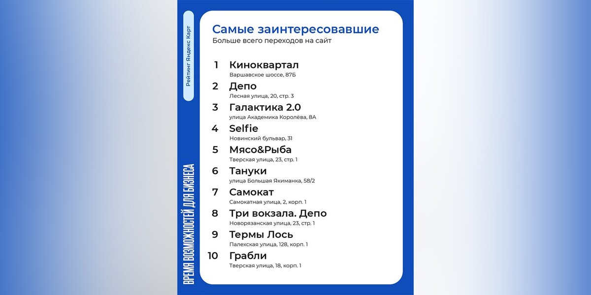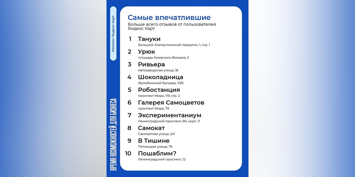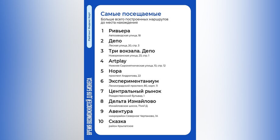 В рамках сотрудничества проекта "Зима в Москве" и поисково-информационной картографической службы "Яндекс Карты" был составлен топ самых популярных у пользователей ресторанов, гастропространств, торговых центров и других площадок. Об этом сообщил портал мэра и правительства Москвы.