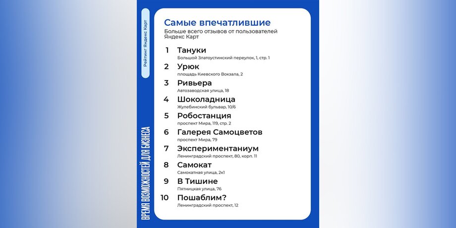 Первая номинация "Самые впечатлившие" формировалась на основе количества отзывов, вторая "Самые высокооцененные" – больше всего самых высоких оценок, третья "Самые рекомендованные" – наибольшее количество рекомендаций от пользователей "Яндекс Карт", четвертая "Самые посещаемые" – самое высокое число построенных маршрутов, и пятая "Самые заинтересовавшие" – наибольшее количество переходов на сайты компаний.