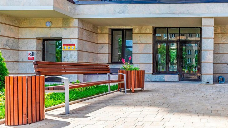 Территория вокруг дома будет благоустроена. На площади около 3,2 тысячи квадратных метров возведут проезды и тротуары, высадят газон, кустарники и деревья, обустроят места для отдыха и спортивные площадки.