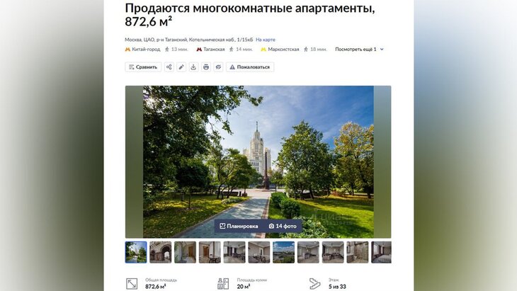 Часть здания в сталинской высотке на Котельнической набережной в Москве выставлена на продажу за 750 миллионов рублей. Объявление доступно на одном из сайтов по аренде и продаже недвижимости.