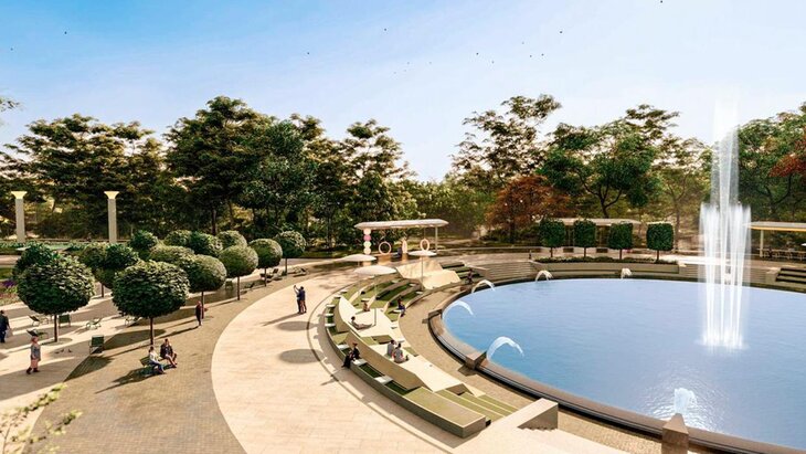 Помимо этого, будет обновлен амфитеатр вокруг фонтана. На самой площади появятся навесы, под которыми разместят павильоны торговли, лавочки, качели и прочее.