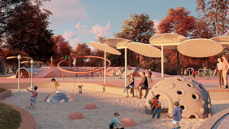 На площадке "Маршрут" установят качели, гамаки, балансиры, горки, сети и тоннель для лазания, а на месте "Панда-парка" разместят башню, лабиринт и переход из канатов. Кроме того, там появятся батуты, качели и археологическая песочница.