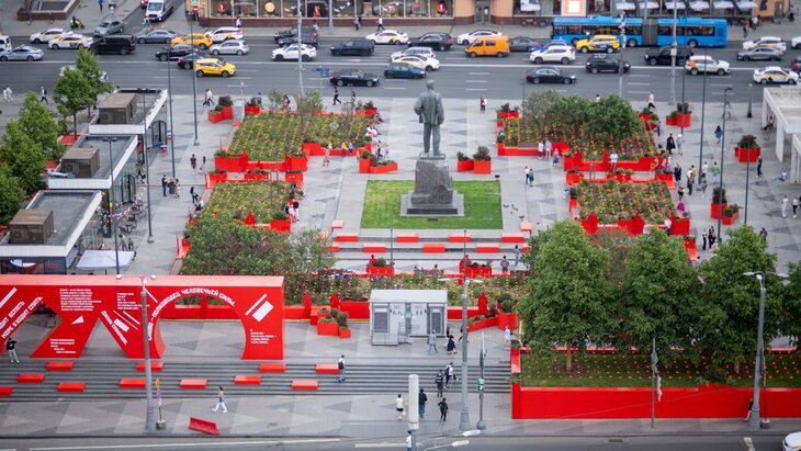 Дополнением к площадке стали также геометричные фигуры поэта, выполненные в красных тонах. Они расположены в разных частях Триумфальной площади – вокруг клумб и бассейнов.