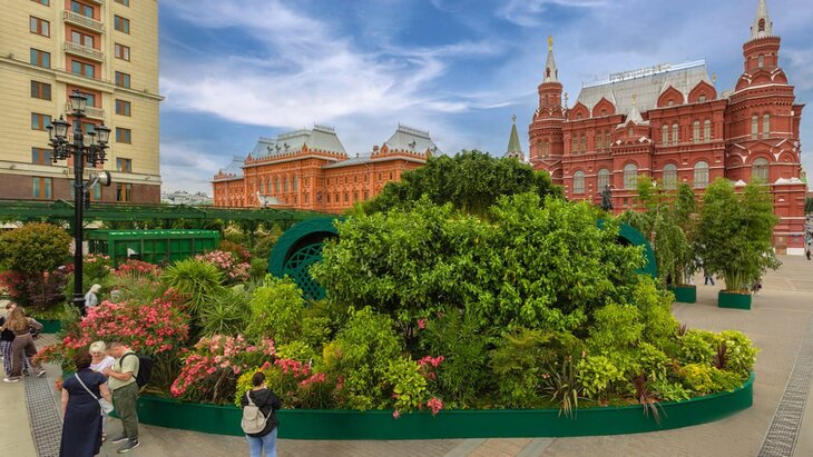 На Манежной площади можно увидеть восьмиметровый водопад и тропики, площадь которых превышает 1,7 тысячи квадратных метров, а также пруд с карпами и черепахами. В центре Москвы высадили растения со всего мира. Желающие смогут прогуляться мимо бамбука, олеандров, сумахов, юкк и японских мушмул.
