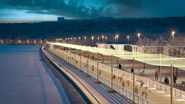 При благоустройстве набережной специалисты заложили инженерные коммуникации и поставили 10 холодильных установок для работы нового объекта. В настоящее время подготовлено основание для устройства катка. Когда поверхность промерзнет, рабочие зальют воду. Лед будет намораживаться слоями.