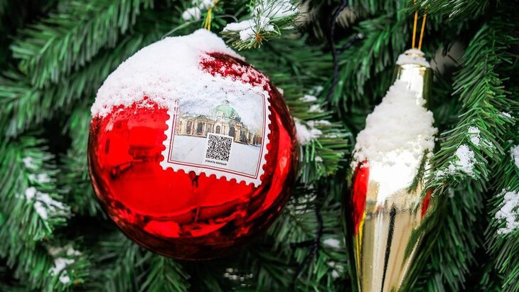 Украшения на елке выполнены в советском стиле: на ветвях разместились елочные шары, гирлянды и флажки, которые дарят ощущение праздника и одновременно несут в себе познавательную функцию. Если подойти поближе, то можно разглядеть архитектурные объекты, изображенные на елочных игрушках.