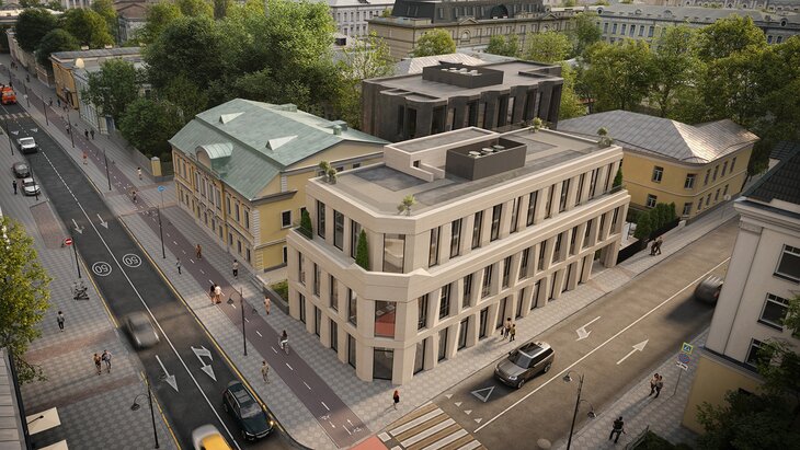 "Первый 3-этажный корпус бизнес-центра решен в сдержанной стилистике, гармонирующей с окружающей средой. Его фасады будут выполнены из стеклофибробетонных плит, что придаст зданию современное звучание без диссонанса с классическими пропорциями соседних строений", – сообщил руководитель департамента градостроительной политики Москвы Владислав Овчинский.